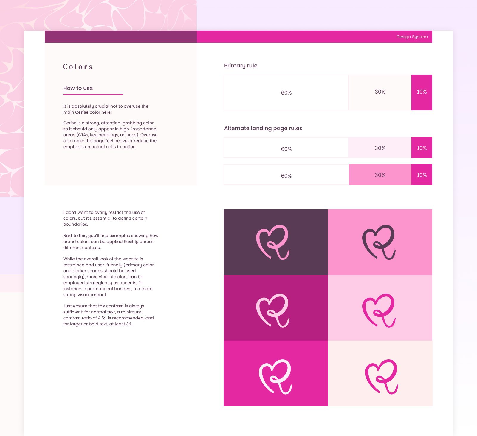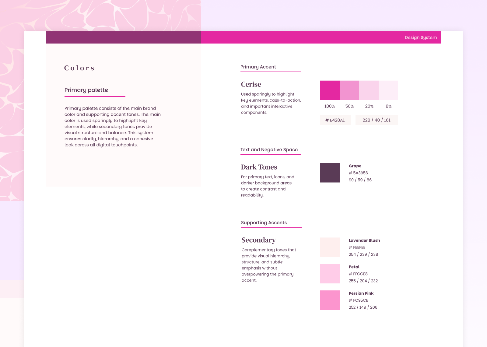 Primary palette consists of the main brand color and supporting accent tones. The main color is used sparingly to highlight key elements, while secondary tones provide visual structure and balance. This system ensures clarity, hierarchy, and a cohesive look across all digital touchpoints.