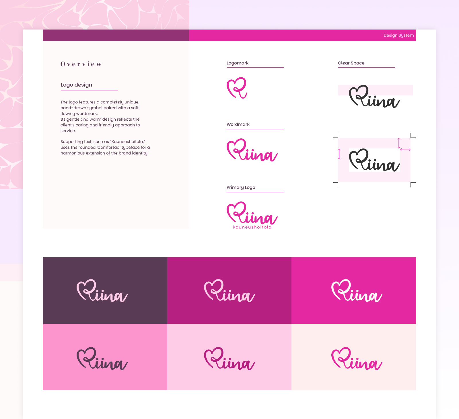 The logo is a cornerstone of the brand’s design system, combining a hand-drawn symbol with a soft, flowing wordmark to convey warmth and approachability. The symbol’s curves reflect the client’s caring and friendly ethos, while the rounded Comfortaa typeface in supporting text (“Kauneushoitola”) ensures harmony across all brand touchpoints.